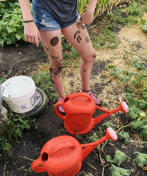 My daughter throwing herself into the watering duties.