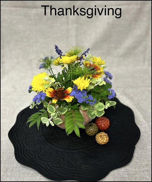 Our Workshop was Thanksgiving, a round arrangement in a gourd or gourd like container. Incorporating grasses, seed heads and pods into your design.