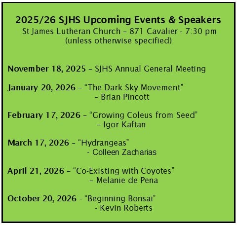 The ST. JAMES HORTICULTURAL SOCIETY provides occasions for interested individuals to compare notes and share information through its programs. We look forward to seeing you at our monthly meetings.