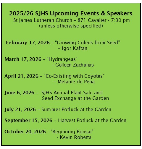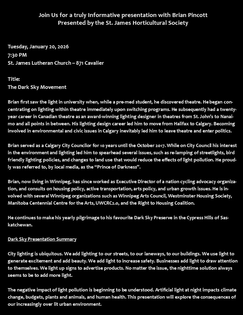 The St. James Horticultural Society extends a heartfelt thank you to Brian Pincott for his fascinating and eye‑opening presentation on The Dark Sky Movement at our January meeting.