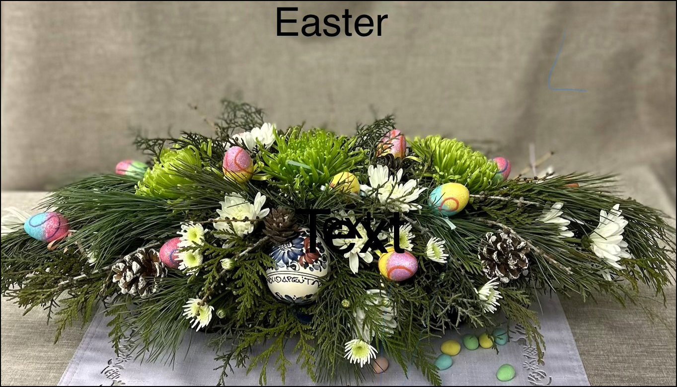 A low horizontal arrangement incorporating eggs (either real or fabricated).