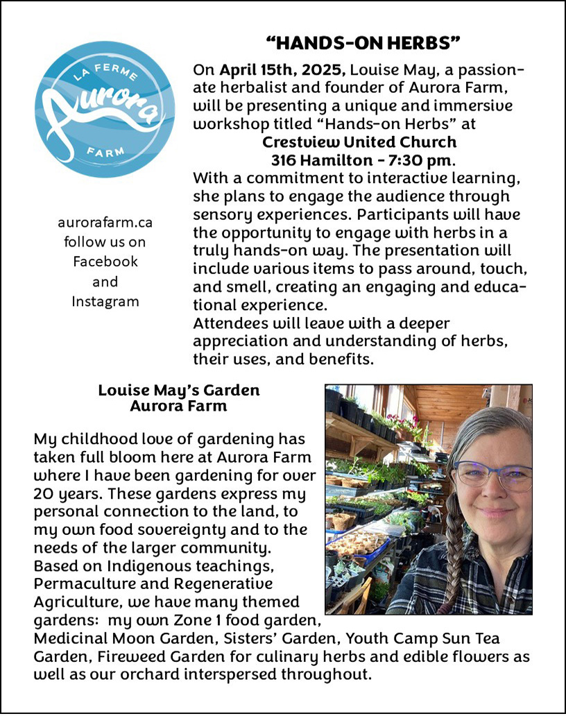 On April 15th, 2025, we had the pleasure of welcoming Louise May, herbalist and founder of Aurora Farm, to Crestview United Church for her engaging workshop, "Hands-on Herbs."