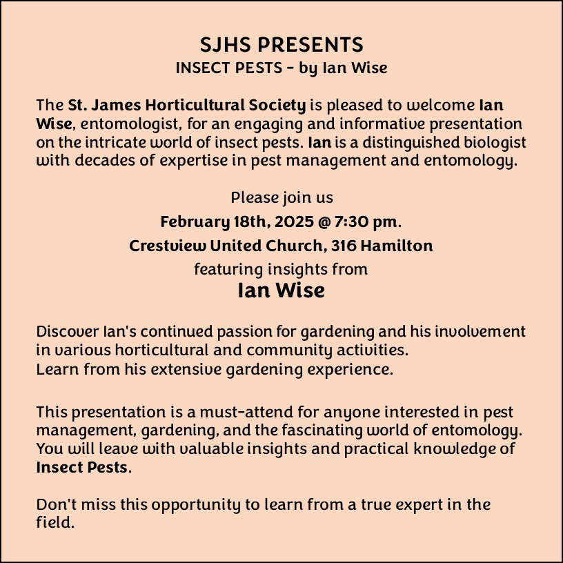 On behalf of the St. James Horticultural Society, I would like to extend our deepest gratitude for your engaging and informative presentation on the intricate world of insect pests. Your insights and expertise in pest management and entomology were both enlightening and inspiring.