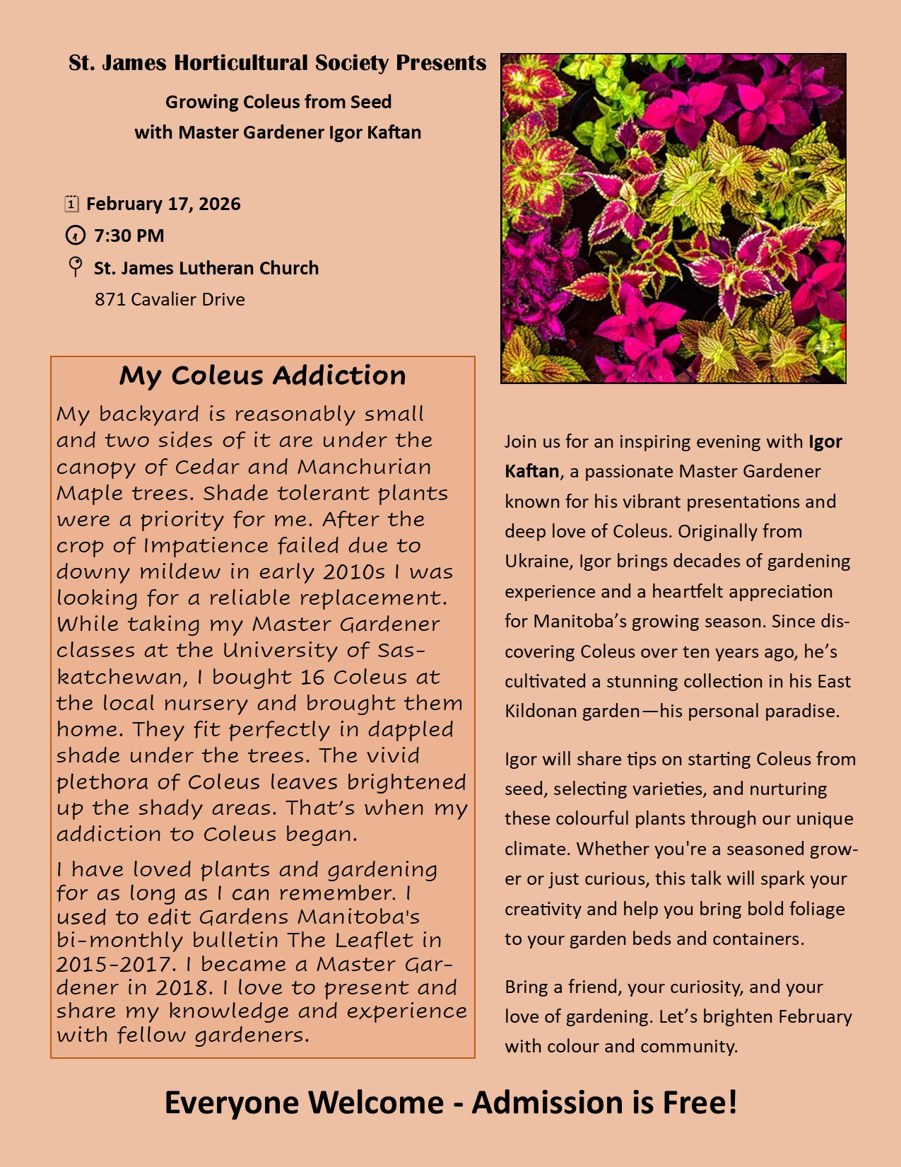 General meetings of the ST. JAMES HORTICULTURAL SOCIETY are held the 3rd Tuesday in the months of October, November, January, February, March and April at 7:30 p.m. General Meetings of the ST. JAMES HORTICULTURAL SOCIETY are held the 3rd Tuesday in the months of October, November, January, February, March and April at 7:30 p.m. at Crestview United Church, 316 Hamilton.