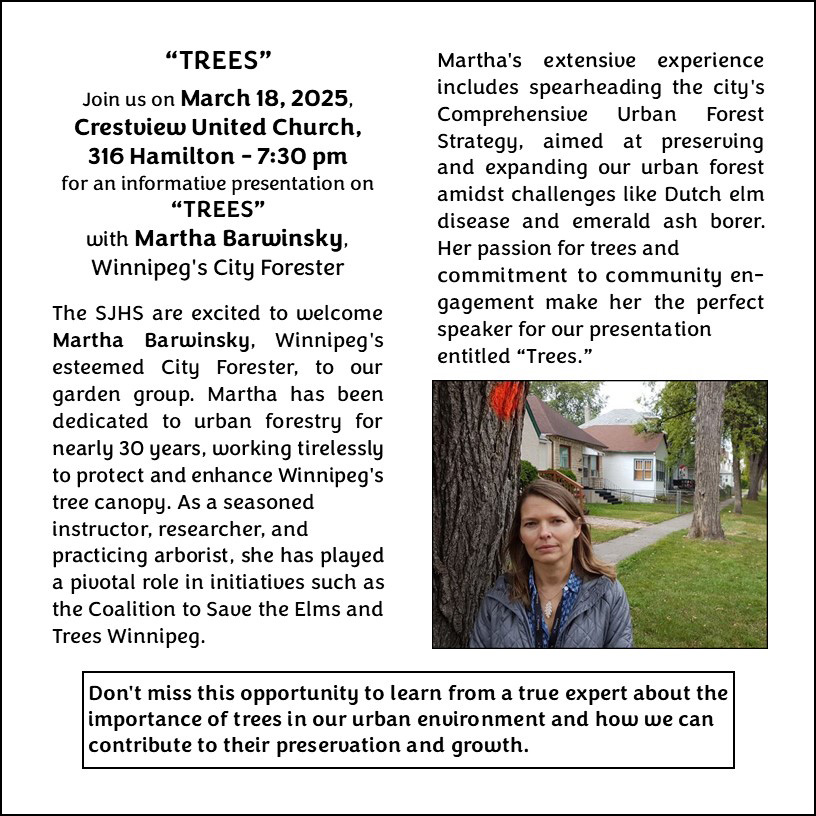 On behalf of the St. James Horticultural Society, we would like to extend our heartfelt thanks to Martha Barwinsky, for the exceptional presentation she delivered on “Trees” on March 18, 2025, at Crestview United Church. The event was well attended, and the lively question-and-answer session showcased the audience's keen interest in her expertise and passion for urban forestry.