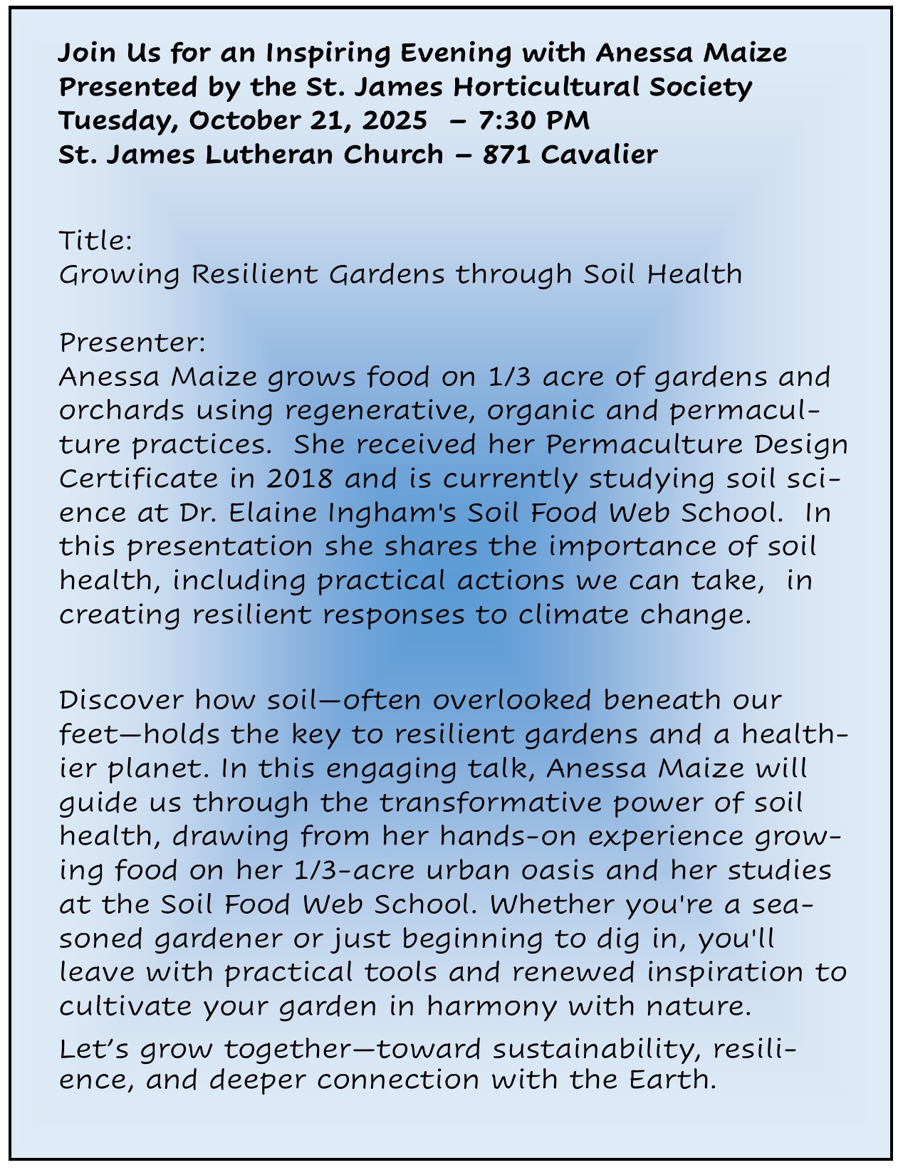 The St. James Horticultural Society extends heartfelt thanks to Anessa Maize for her inspiring presentation, “Growing Resilient Gardens through Soil Health,” held on Tuesday, October 21, 2025, at St. James Lutheran Church.