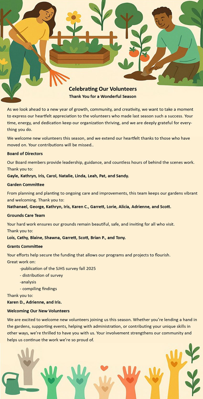 Members participated in the election of directors, ensuring strong leadership for the year ahead. While the position of 2nd Vice President remains open, we are confident that a dedicated volunteer will step forward to fill this important role. Garrett Queau was elected as our new Garden Committee Representative. We look forward to welcoming him to the team.
